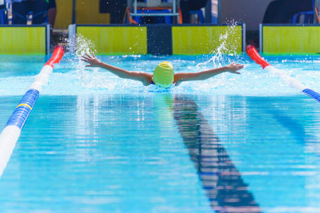 Swimmer child swims butterfly swimming style in a race swimming pool. Water sports and competition, learning to swim classes for children.