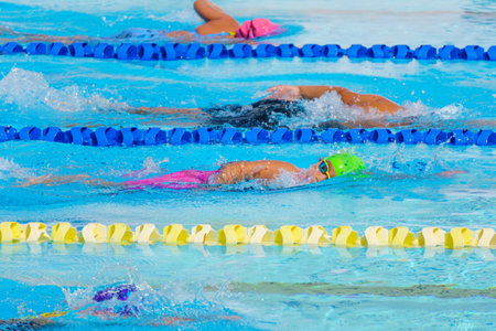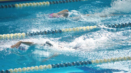 Indoor big sport swimming pool. Lots of children swimming along multiple lanes. Healthy active lifestyle concept. Sports school learning class or competition with copy space