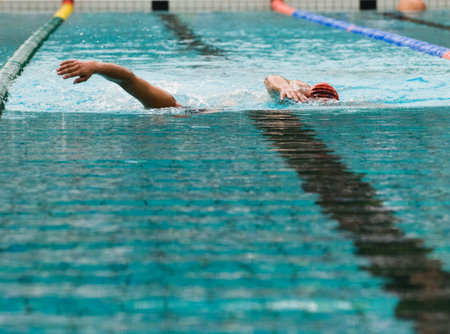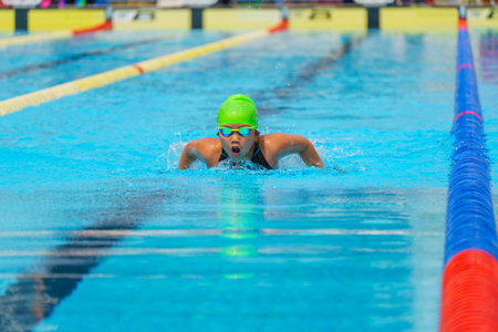 Swimmer child swims breaststroke swimming style in a race swimming pool. Water sports and competition, learning to swim classes for children