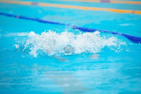 Swimmer child swims freestyle swimming style in a race swimming pool. Water sports and competition, learning to swim classes for children
