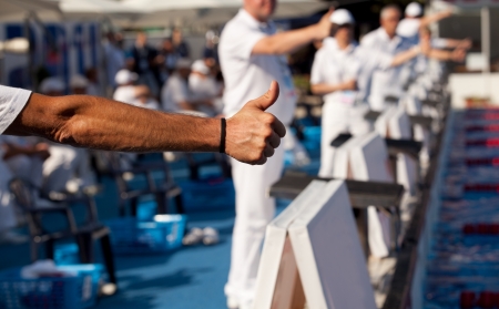 Atlanta,Georgia, June 28, 2012:Young swimmers at a competition swim meet entering the water for their lap. Lake Forest vs St. Marlo.