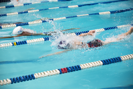Young boy swimmers raceing furiously in freestyle stroke at a local pool