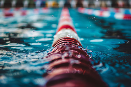 Close-up View of Water Ripples Around Lane Rope in Swimming Pool, Summer Sports Concept