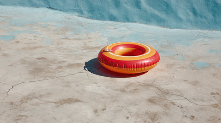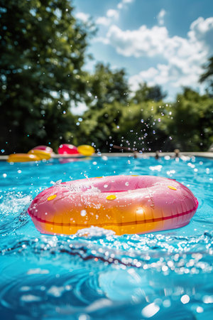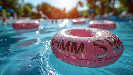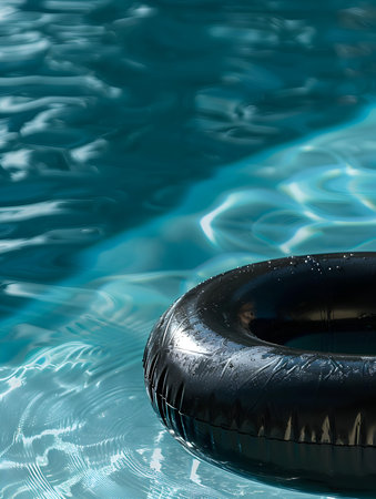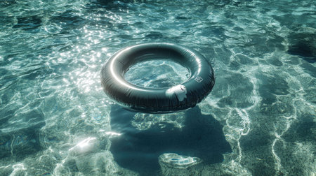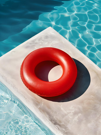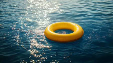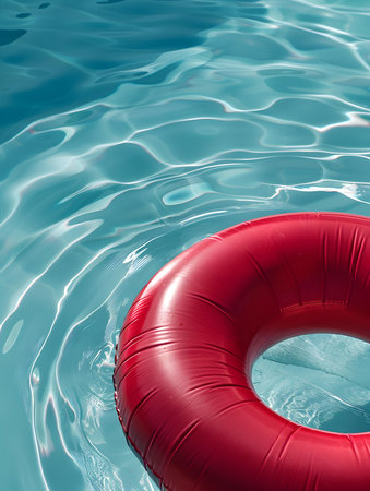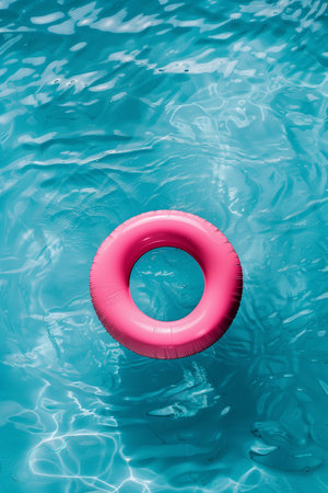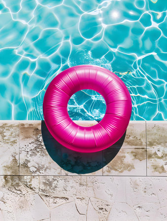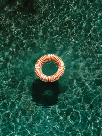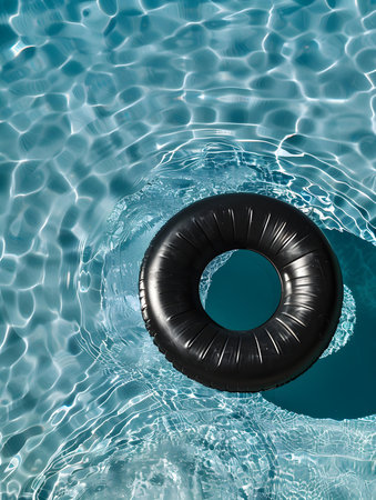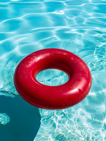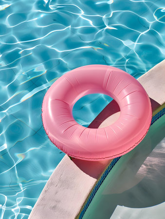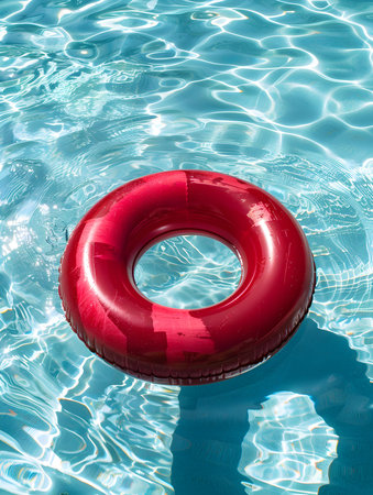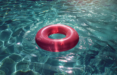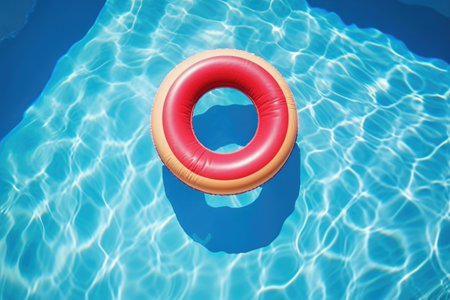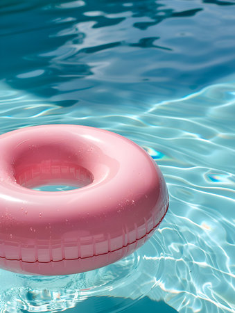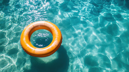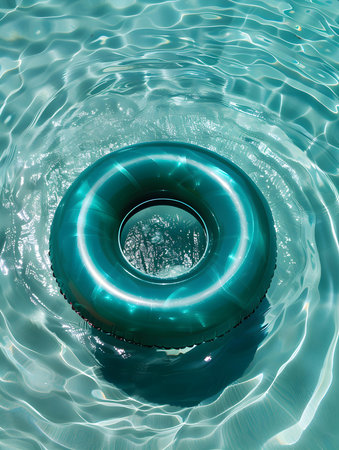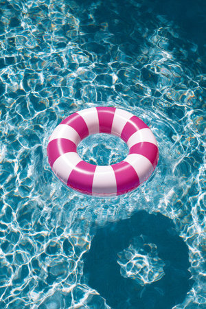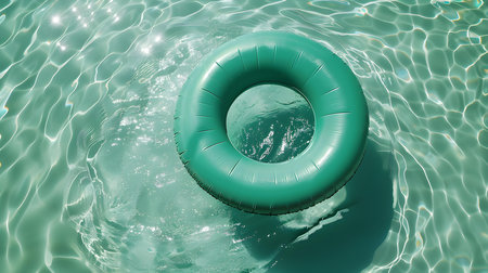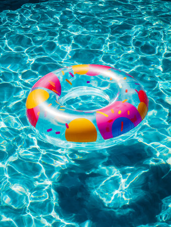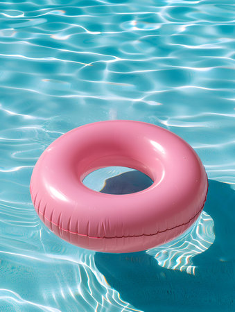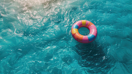 Inflatable ring floating on the surface of a pool, surrounded by sunlight and clear water, perfect for a vacation or relaxation concept.