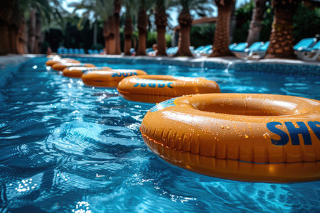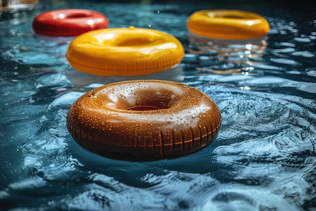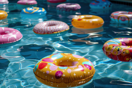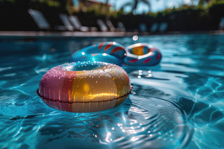 Vibrant inflatable swim rings gently bobbing on the surface of a sunlit swimming pool