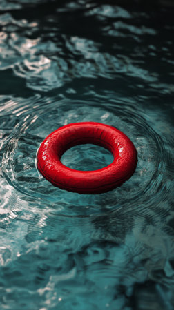 A vibrant red life ring drifts gently on the surface of clear blue water, creating ripples as sunlight glimmers off the waves, indicating a calm summer afternoon.