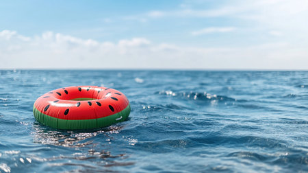 A vibrant watermelon-themed inflatable ring floats serenely on the surface of the deep blue ocean under a clear, sunny sky.