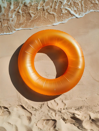 Top view of a light orange inflatable swimming ring on the beach