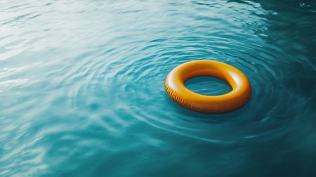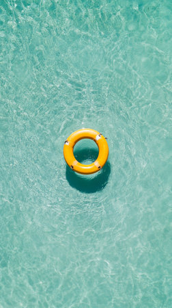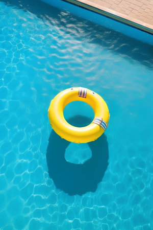 Bright yellow lifebuoy floating on the tranquil surface of a clear turquoise swimming pool, offering a sense of safety and relaxation on a summer day