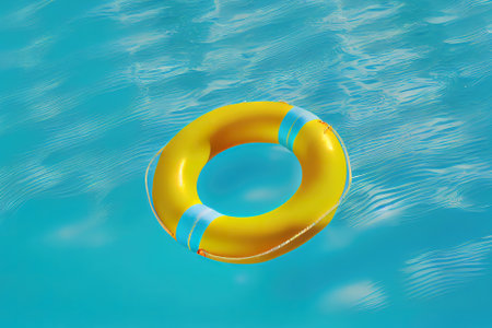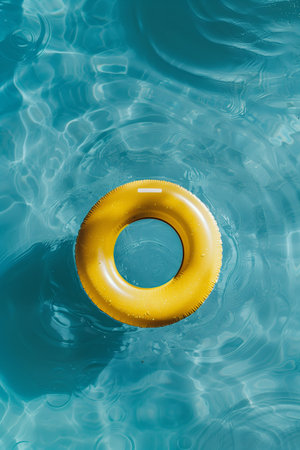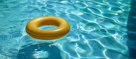 A vibrant yellow lifebuoy floats atop sparkling clear water in a serene pool setting, capturing the essence of summer and leisure perfect for vacation-themed visuals.