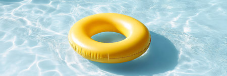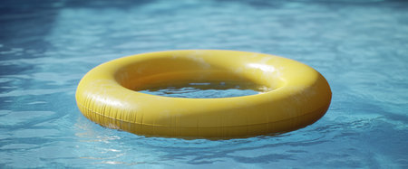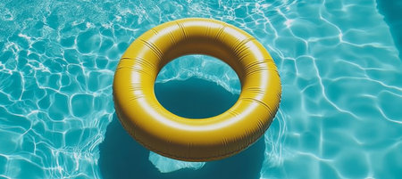 Bright yellow inflatable ring floating on the tranquil surface of a clear blue swimming pool, creating a relaxing and inviting summer holiday scene