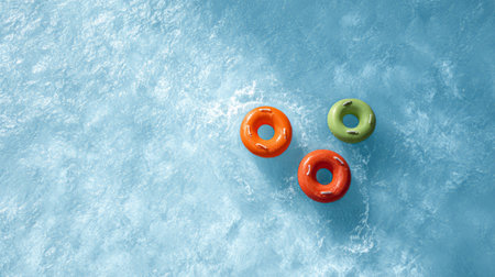 Three vibrant inflatable rings gently float on the surface of a crystal clear pool, evoking a sense of carefree summer enjoyment and aquatic adventures
