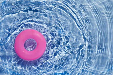 Pink pool float ring floating in a refreshing blue swimming pool. Top view