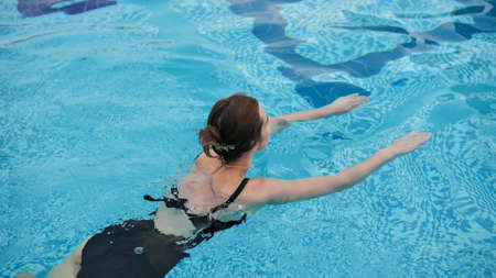 A young beautiful woman swims in a pool. Freedom concept. Calmness and relax, woman happiness.