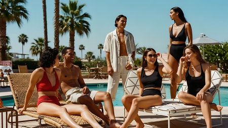 A diverse group of young adults enjoying a beach day, wearing colorful swimsuits, laughing and posing together by the ocean, with palm leaves in the background