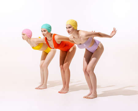 Three women in colorful swimsuits and swimming caps lying in goggles against grey background. Sunbathing. Vintage look