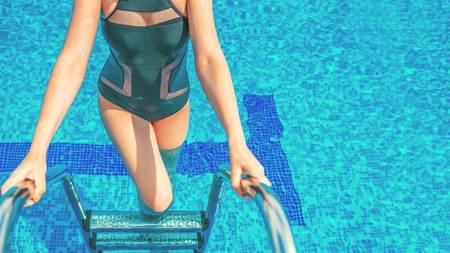 Female getting out of the blue water in the pool. Beautiful young woman at swimming pool. Toned with cope space for text