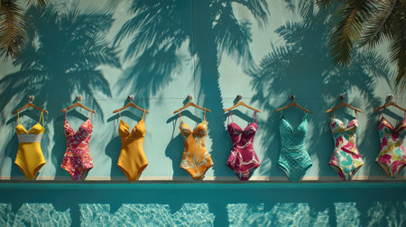Display of designer swimsuits on floating pool platform with palm shadows overhead