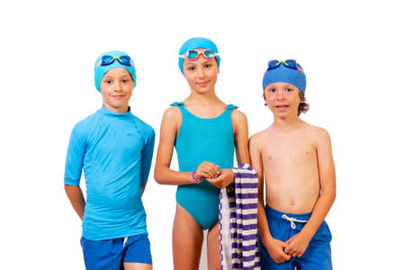 Children dressed in swimsuits for swimming lessons in the pool. white background