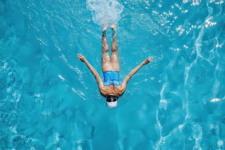 Aerial Top View Male Swimmer Jumping, Diving into Swimming Pool. Professional Athlete Winning World Championship. Top Down View.