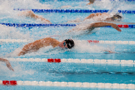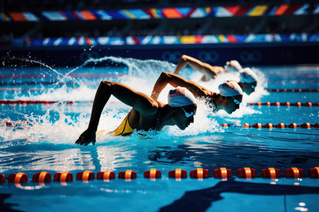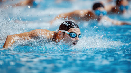 Swimmer s intense focus in freestyle stroke at summer olympics, showcasing sportsmanship
