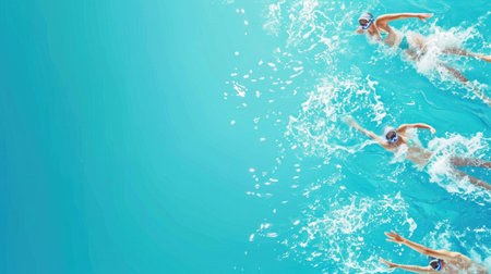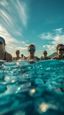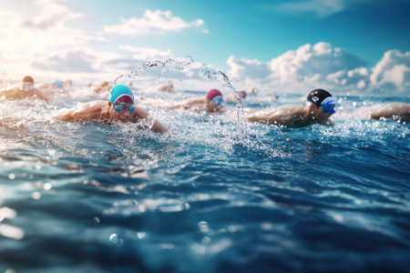 A dynamic shot capturing multiple swimmers during an open water race, with the lead athlete creating significant splashes in the blue water. ideal for sports and fitness themes.