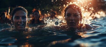 Group of mature individuals wearing wetsuits and goggles, swimming in open water during sunset. Focus on adventure, fitness, and camaraderie.