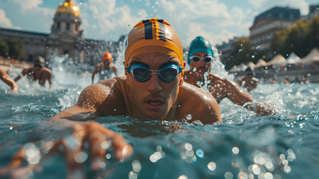 Swimming competition in the city of Paris. Athletes swim in the pool.