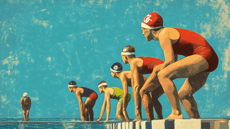 Swimmers preparing at the starting blocks, tense with anticipation.