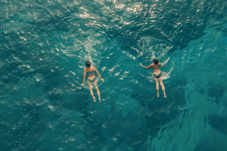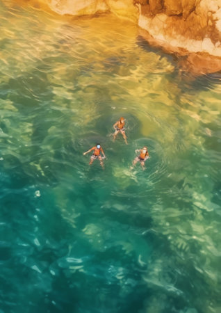 Happy people enjoying summer vacation, swimming in the crystal-clear blue sea.