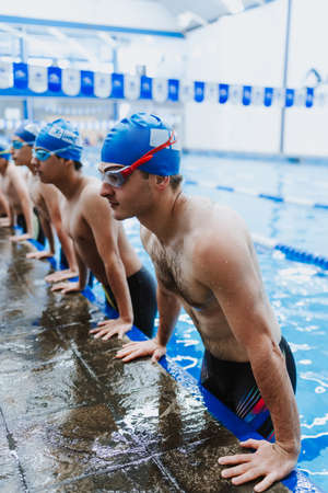 start position race concept with fit swimmer on swimming pool