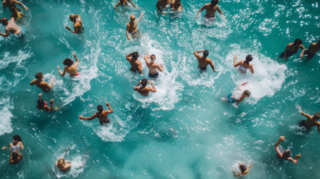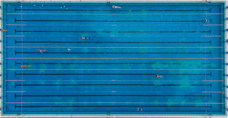 Aerial top view of group of swimmers training in swimming pool. Many sportive people swim in Open Water Swimming pool.