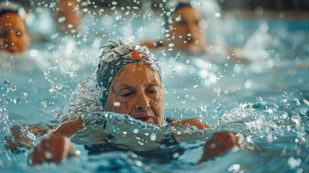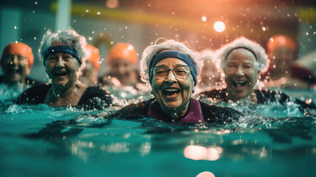 Exercise in water, Active senior women enjoying aqua fit class in a pool, displaying joy and camaraderie, embodying a healthy, retired lifestyle. Generative Ai