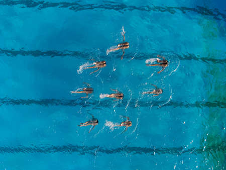 Aerial view of group synchronized swimmers performance with legs