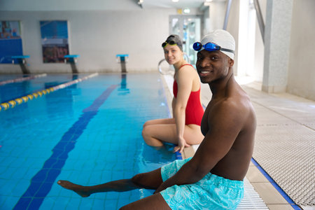Young woman and men swimming club teammates sitting at the pool and talking