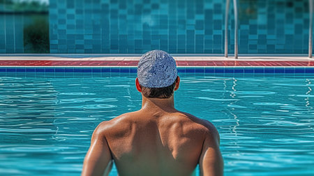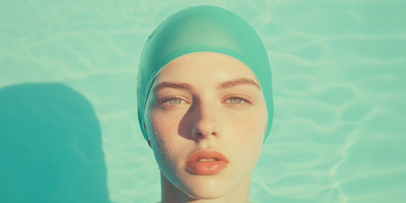 Swimmer with latex swim cap floating in a pool under bright sunlight in a serene aquatic environment