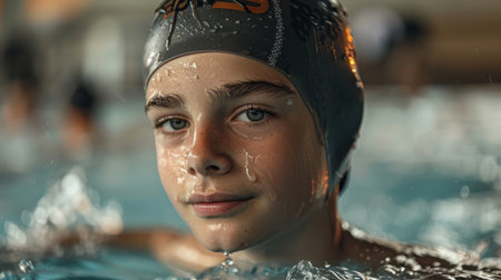 close-up swimmer's young woman face, wearing swim cap. goggles are covered with water droplets, and blurred background highlights swimmer's intense focus and determination AI generated