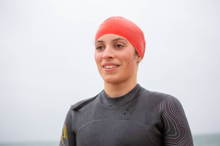 Triathlete swimmer portrait wearing wetsuit on training