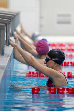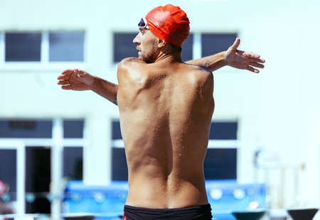 Race of a professional swimmer who concentrates, breathes before training. Concept of: sport, swimming pool, competition, fitness.