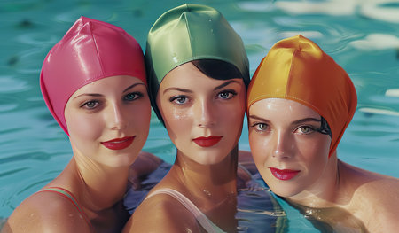 Three women wearing cap swimmings are swimming in a pool. They are enjoying their time in the water, possibly practicing their swimming skills or exercising. The women appear focused and determined as they move through the water.