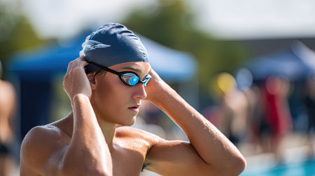 A young male swimmer wearing a cap and goggles, adjusting his gear and stretching before a swim race