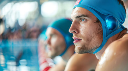 Portrait of a young male water polo player in a blue cap, looking away from the camera.