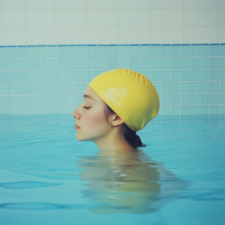 Serene young woman with swimming cap immersed in water, eyes closed, enjoying a peaceful moment in the pool. Relaxation and wellness concept.