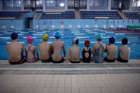 Back view of a group of happy young children wearing swimwear sitting at the swimming pool.