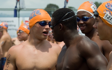MIDMAR DAM - 10 FEBRUARY 2013: Unidentified swimmers prepare to participate in the main swimming event of the Midmar Mile near Howick, KwaZulu-Natal, South Africa.