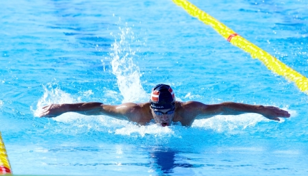 Swim competition swimmer athlete doing butterfly stroke in swimming pool