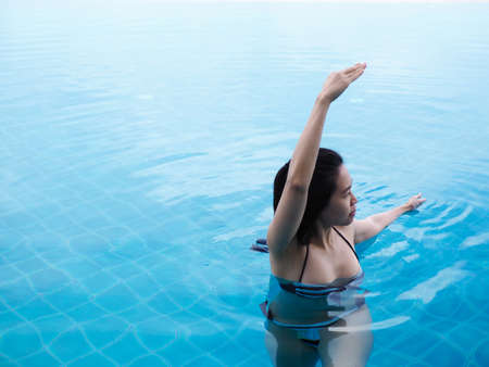 Unrecognizable woman in the pool water. Tropical vacation theme concept. Summer holiday background.