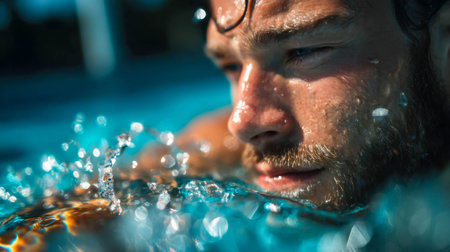 A swimmer practices in a pool, wearing sleek goggles and displaying determination. The water ripples around, highlighting the intensity of the training effort.