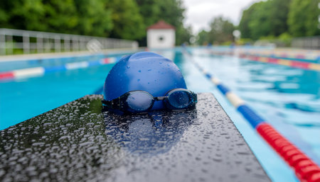 Wet blue swim cap and goggles rest on a dark starting block at an outdoor swimming pool Vibrant lane lines and lush greenery are blurred in the background