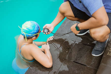 A young girl looking at the stopwatch that the coach shows by the pool during swimming practice